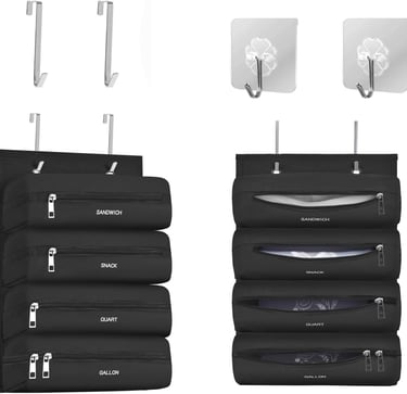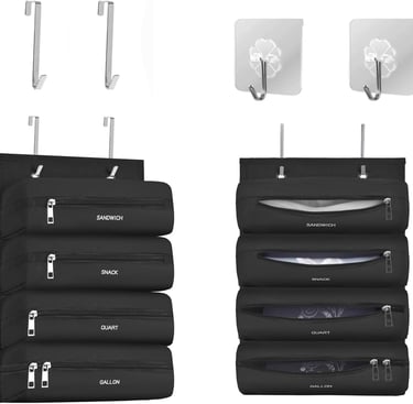 This hanging food storage bag organizer keeps all your Ziploc bags neatly separated with four compartments, making it easy to grab the right size while keeping your kitchen tidy and clutter-free.