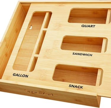 This bamboo food storage bag holder keeps your drawer neat and organized, with four slots to hold gallon, quart, sandwich, and snack bags and optional labels for easy identification.