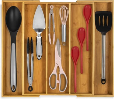 Expandable or modular drawer organizers are perfect for spatulas, spoons, and turners. These work best in shallow drawers near your stove or prep area.