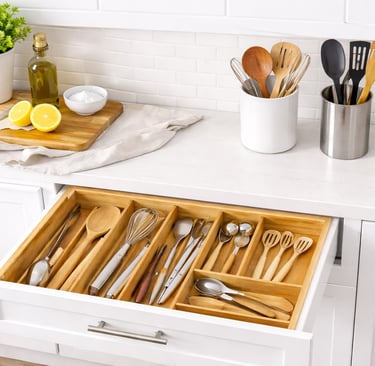 Drawers are ideal for keeping utensils hidden, clean, and visually calm. The key is choosing organizers that fit your drawer size and utensil types.